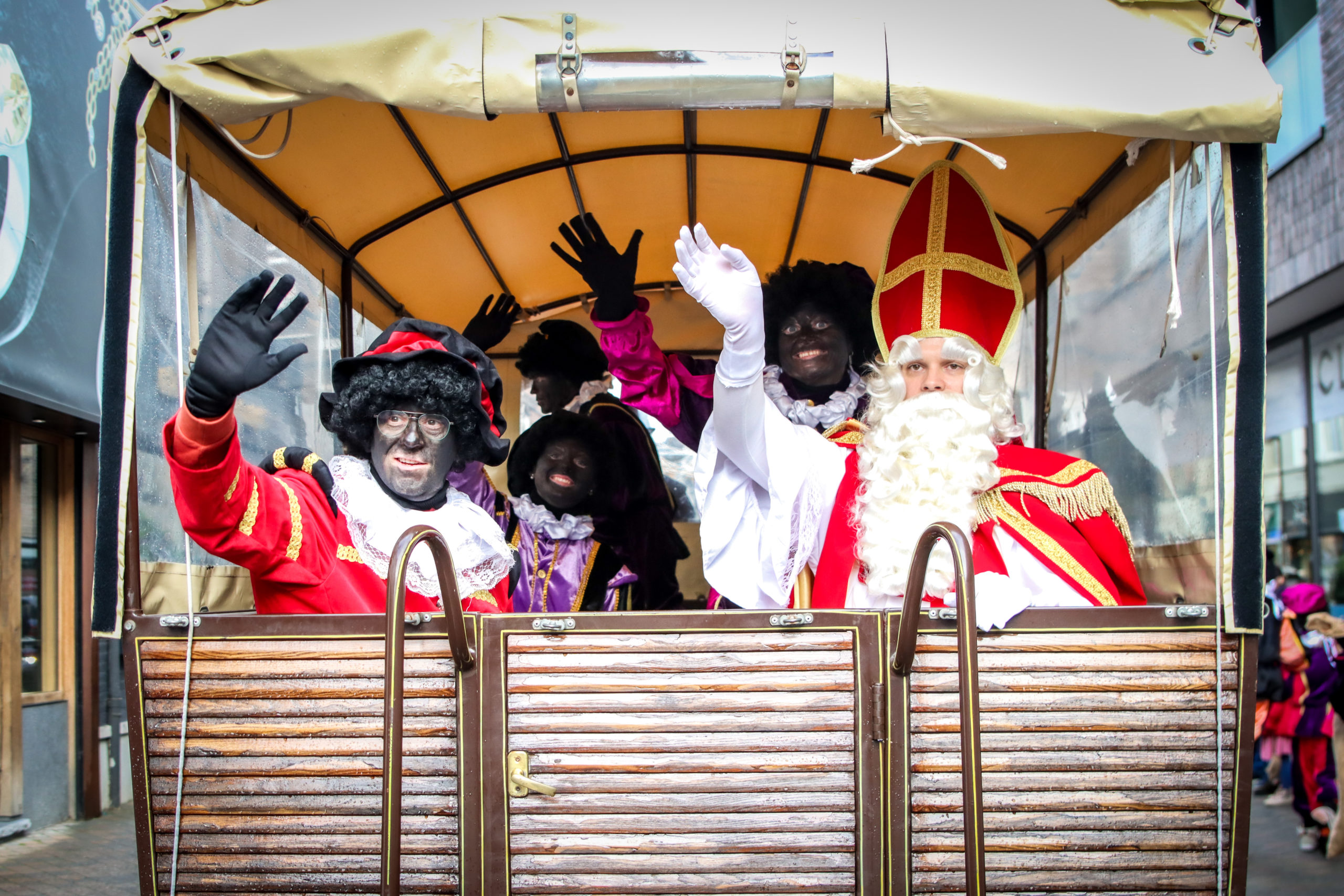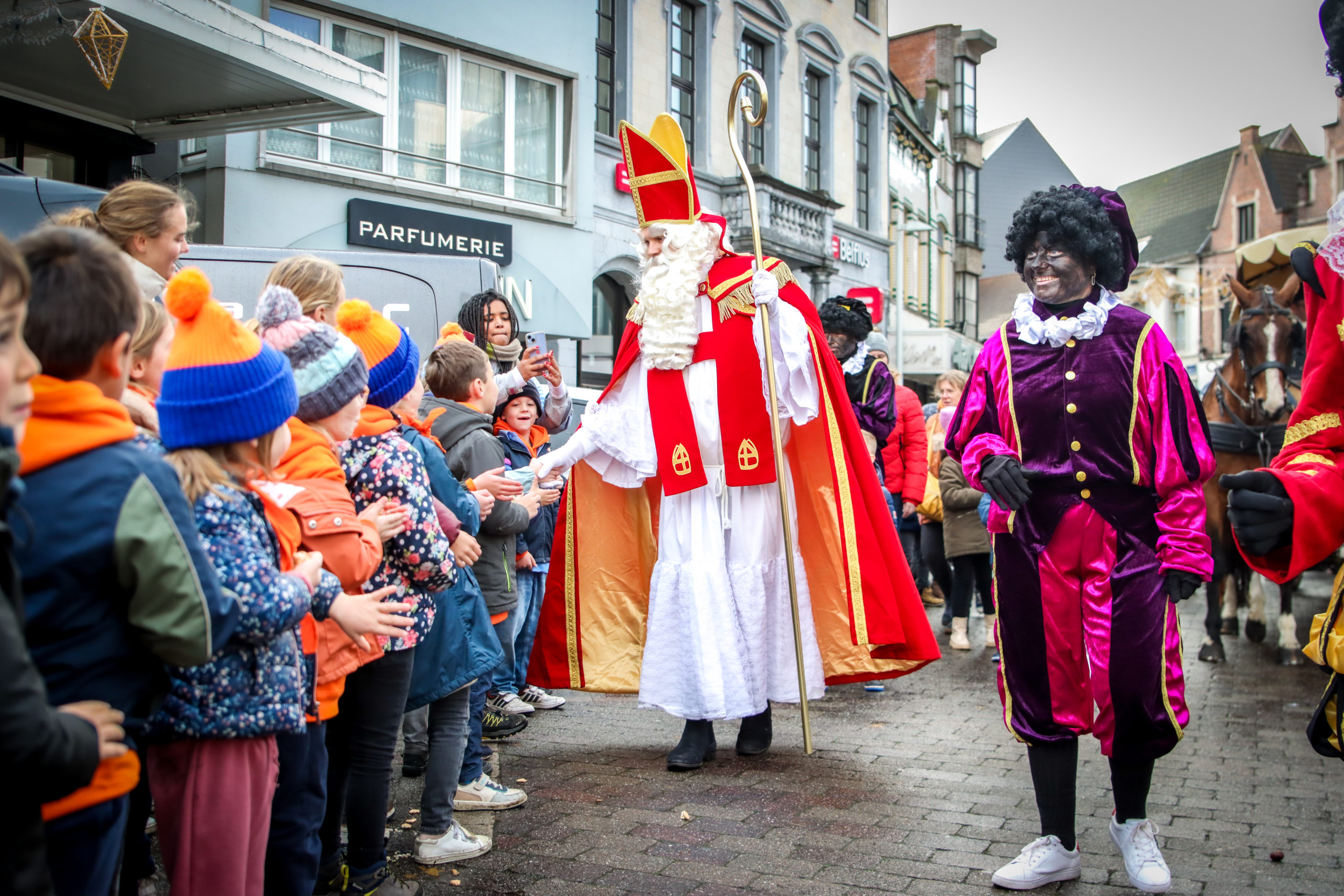 Afgelopen zaterdag trok Sinterklaas per koets door het stadscentrum. De Sint vertrok (hoe kan het ook anders in paardenstad Waregem) aan de Hippodroom en trok samen met zo’n 20 pieten door de Holstraat naar de Markt. Daarna trok het gezelschap door de winkelstraten Stationsstraat en Stormestraat terug naar de Markt en winkelcentrum Het Pand. “Mijn pieten vertelden me op voorhand al dat Waregem een levendige stad is”, vertelde de heilige man. “We moesten zelfs nog snoepgoed en chocolade bijhalen om alle brave kinderen te belonen. Gelukkig hebben jullie in Waregem leuke winkels. Leonidas, D’Origine en Albert Heijn mogen zich dan ook trotse Sintleveranciers noemen”, verklapte Sinterklaas.